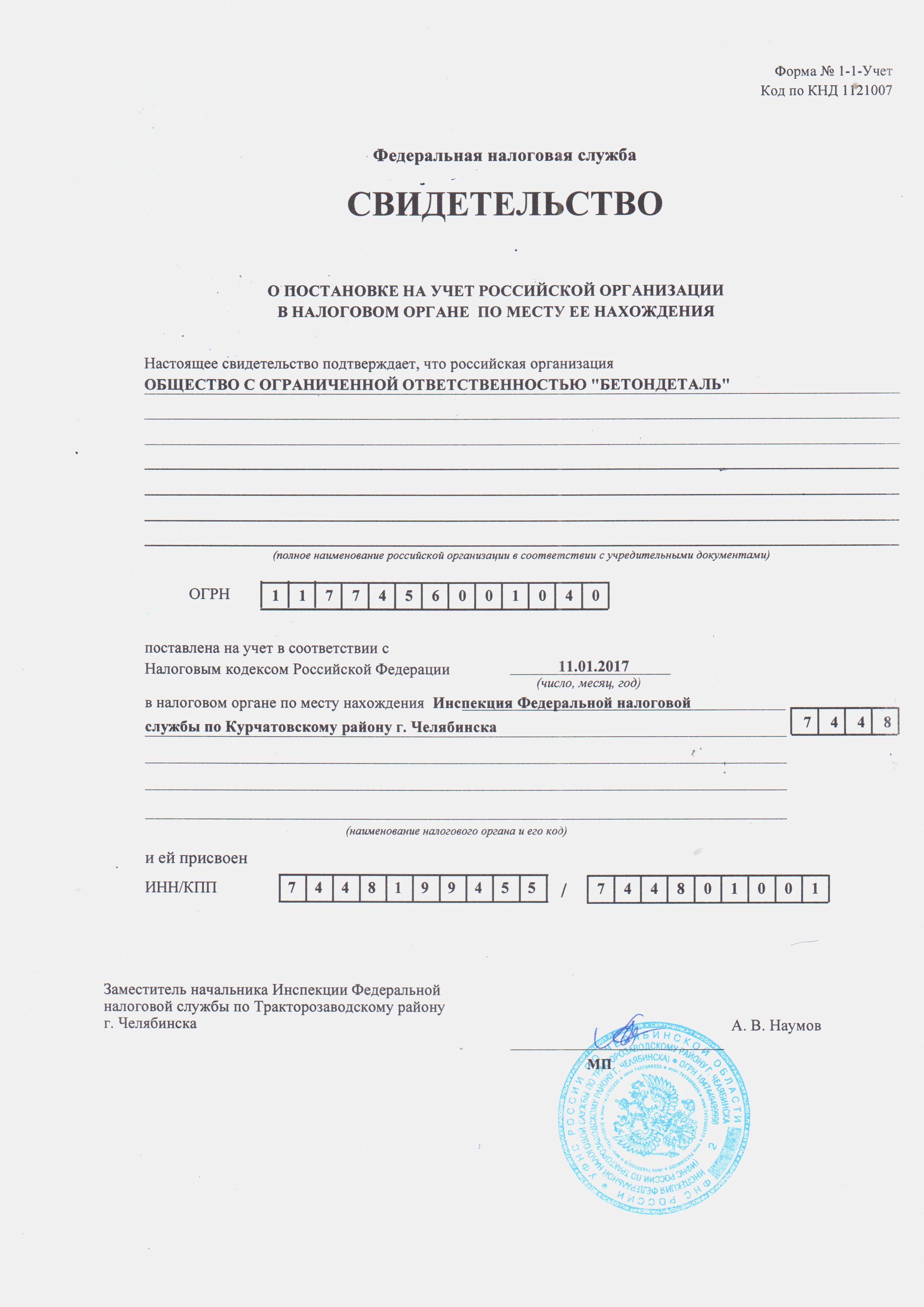 Свидетельство о постановке на налоговый учет