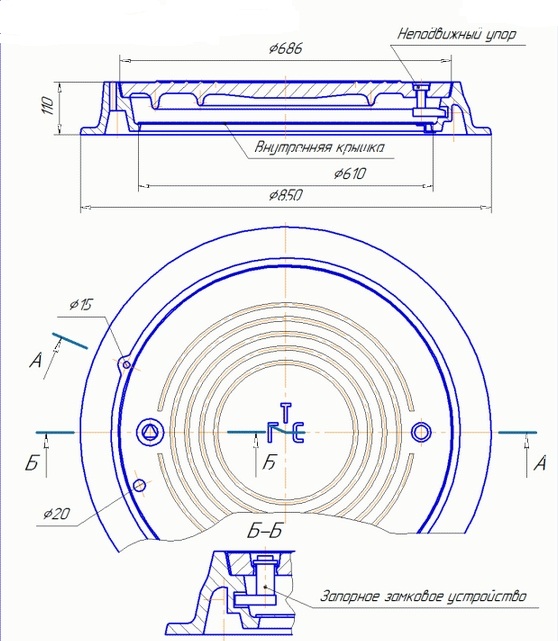 Внутренняя крышка легко вкладывается в корпус люка, а запорная планка размещается на скобу внутренней крышки и таким образом запирает ее в корпусе люка. В состав конструкции изделия также может входить замок, который обеспечивает защиту от несанкционированного проникновения в колодец посторонних.